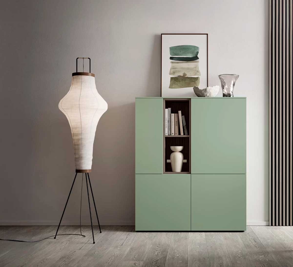 I sistemi modulari e componibili rappresentano una soluzione estremamente versatile per i piccoli spazi: grazie alla possibilità di combinare vani chiusi, moduli aperti, pannellature e superfici d’appoggio, questi mobili possono trasformarsi nel tempo in base alle esigenze. Ad esempio, come nell’immagine sotto, è possibile aggiungere in qualsiasi momento un pannello appendiabiti nel living se coincide con la zona di ingresso.