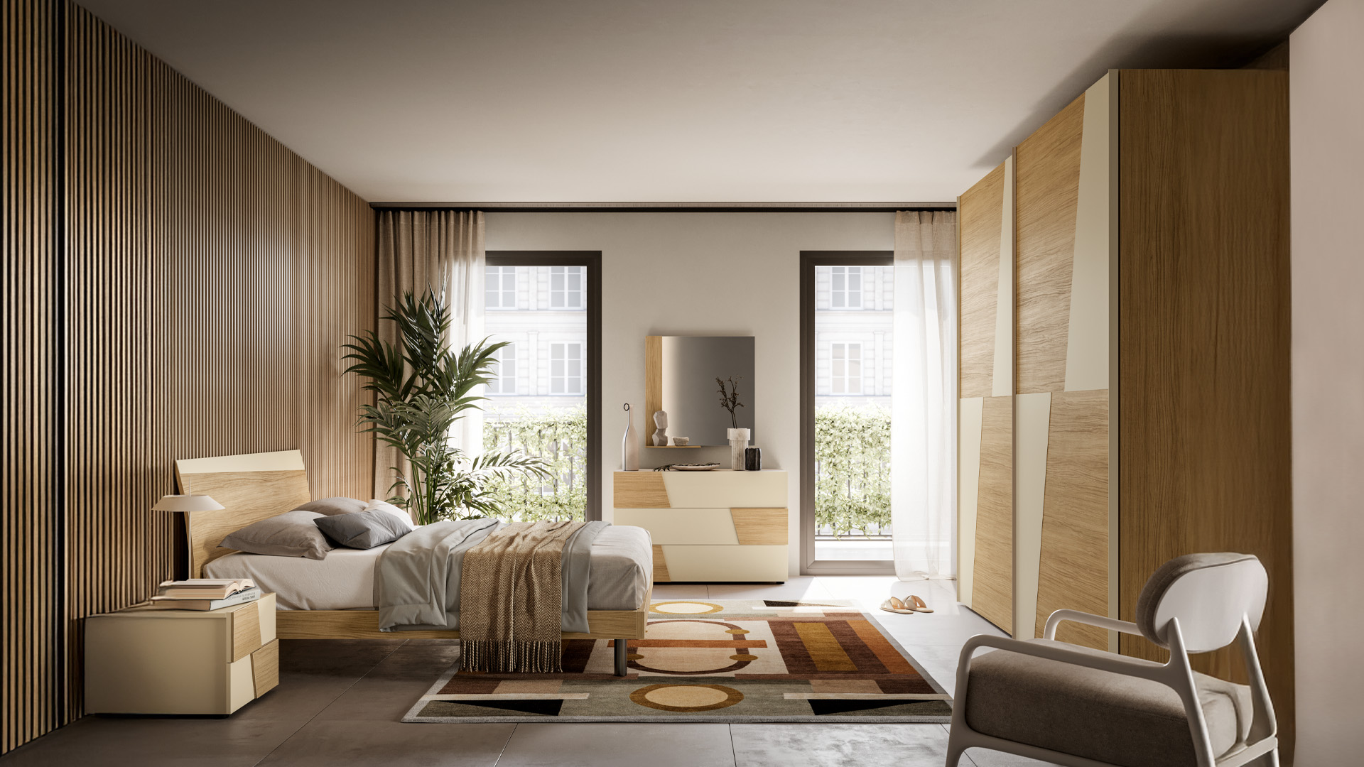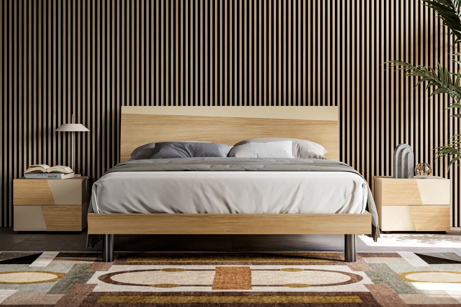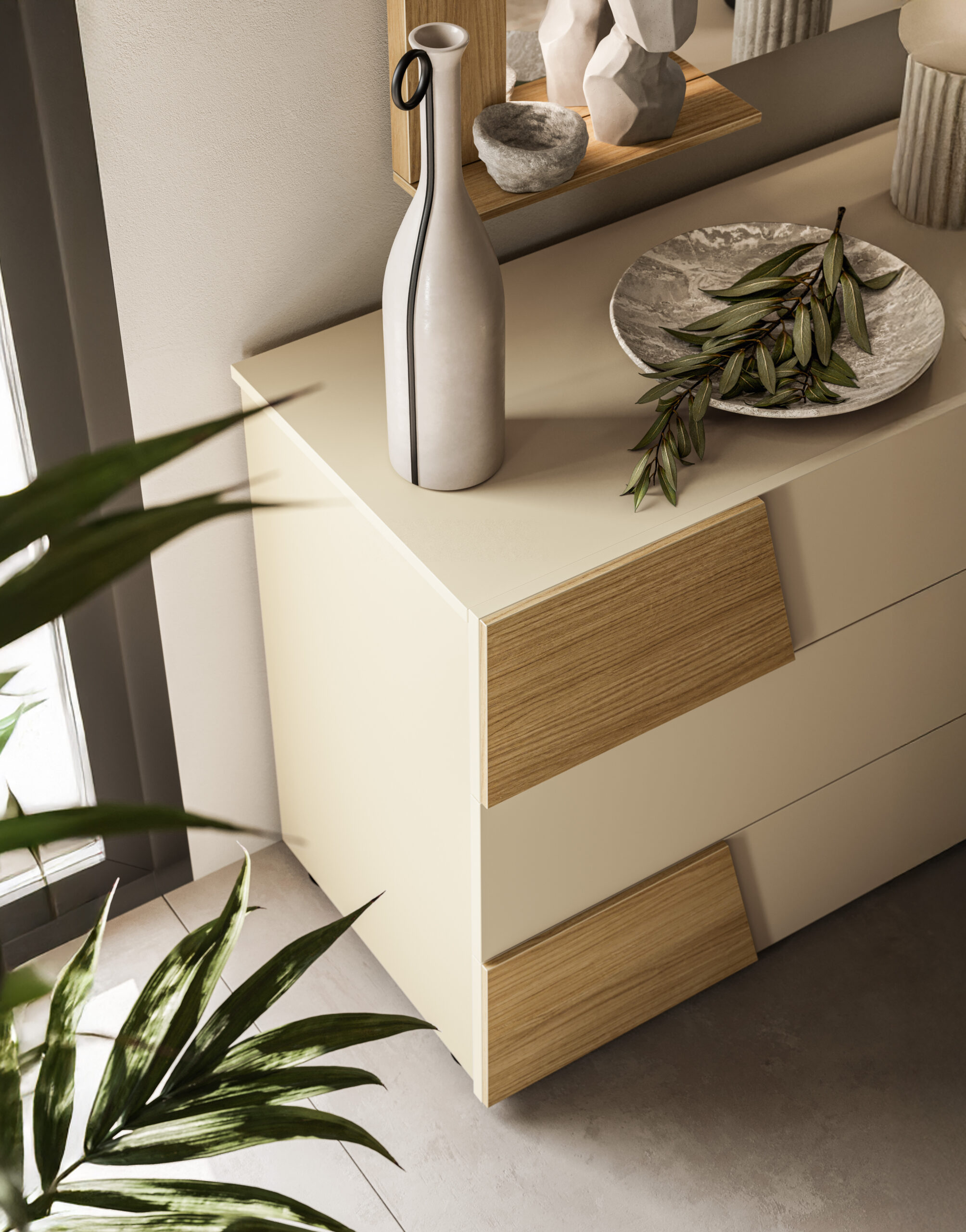 in pale and neutral tones, paired with the warm shades of the wood.