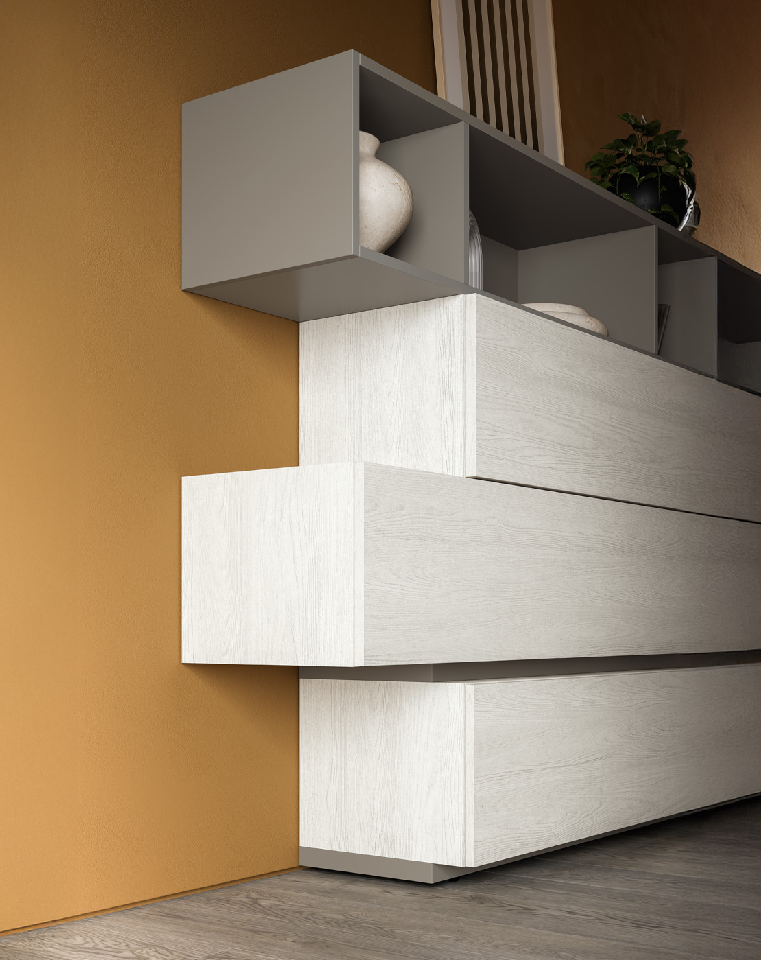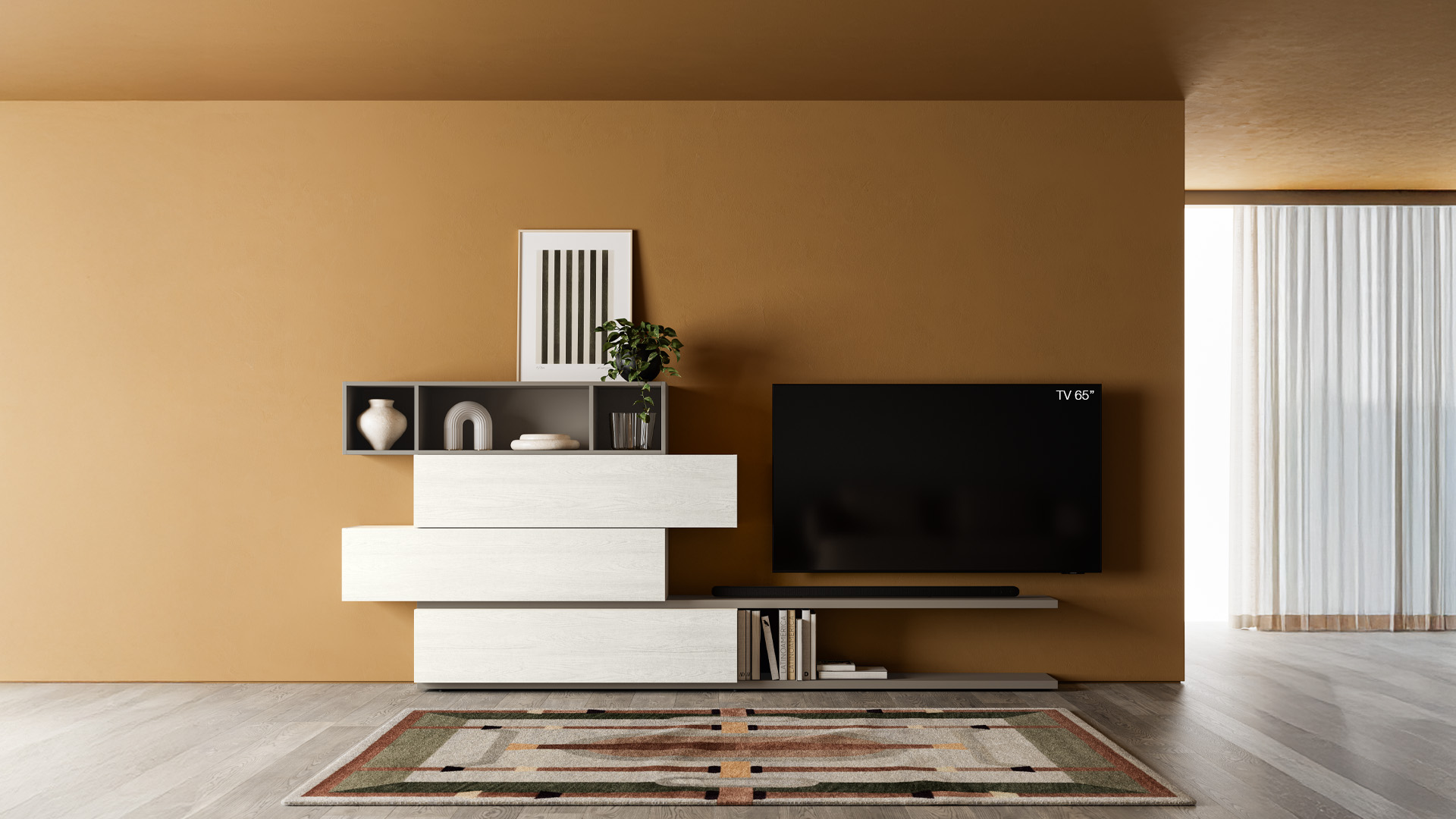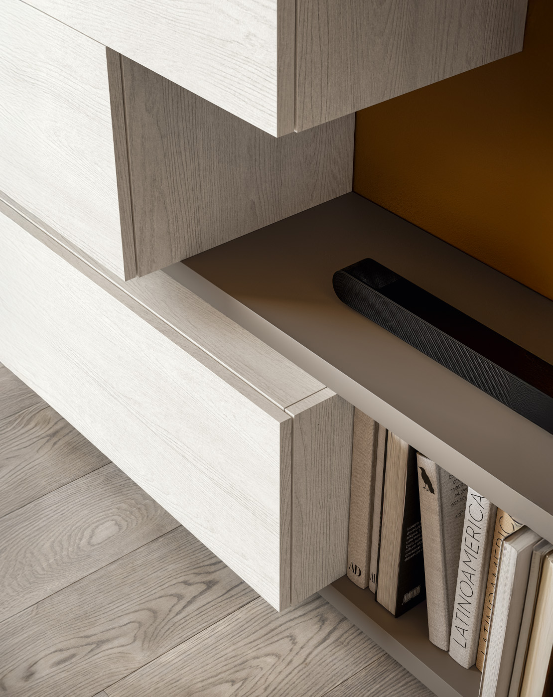 Modern living room decor with staggered horizontal units and extra-thick shelves that offer plenty of practical storage space. In the upper part, the delicacy of a unit with open compartments.