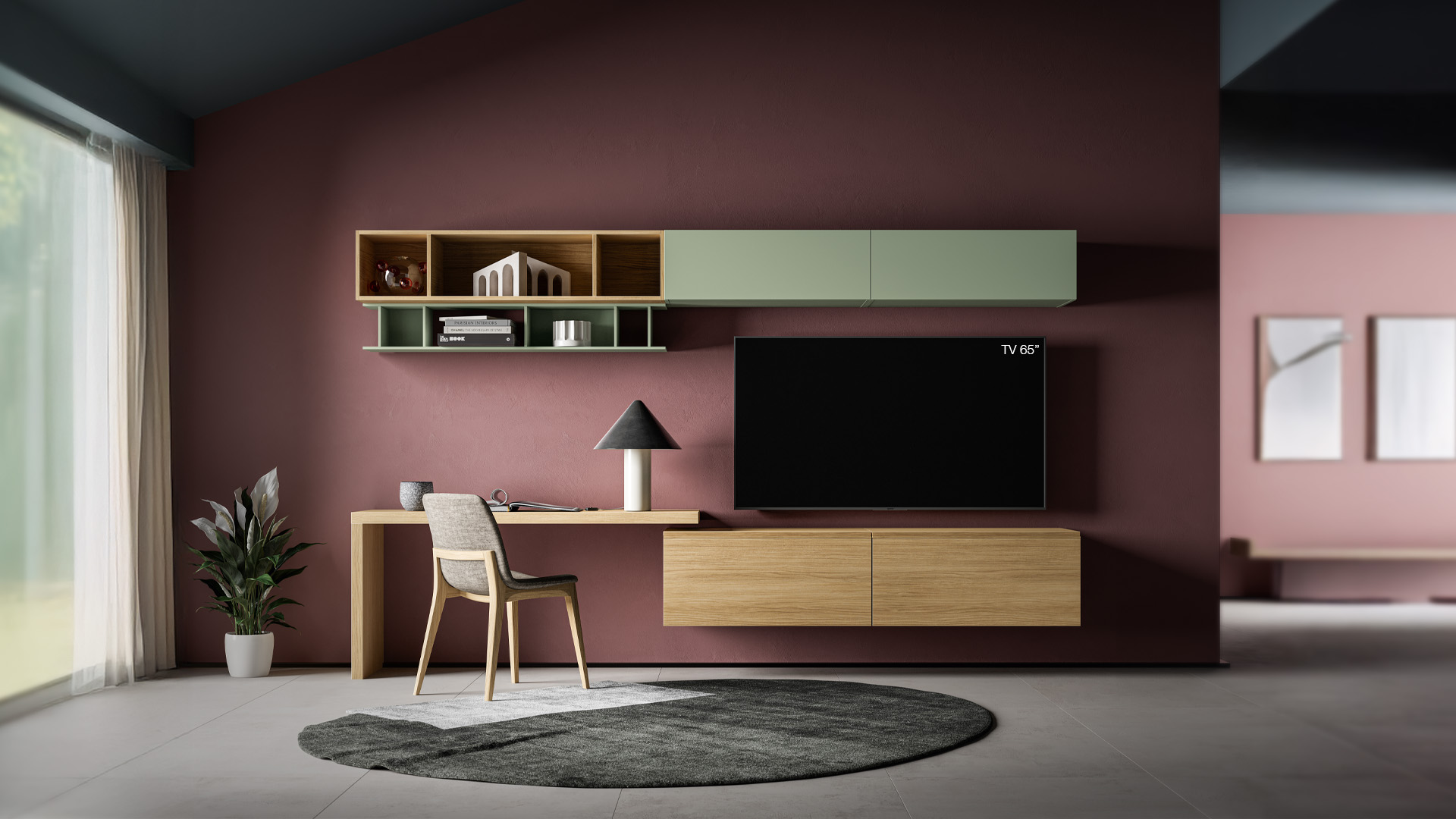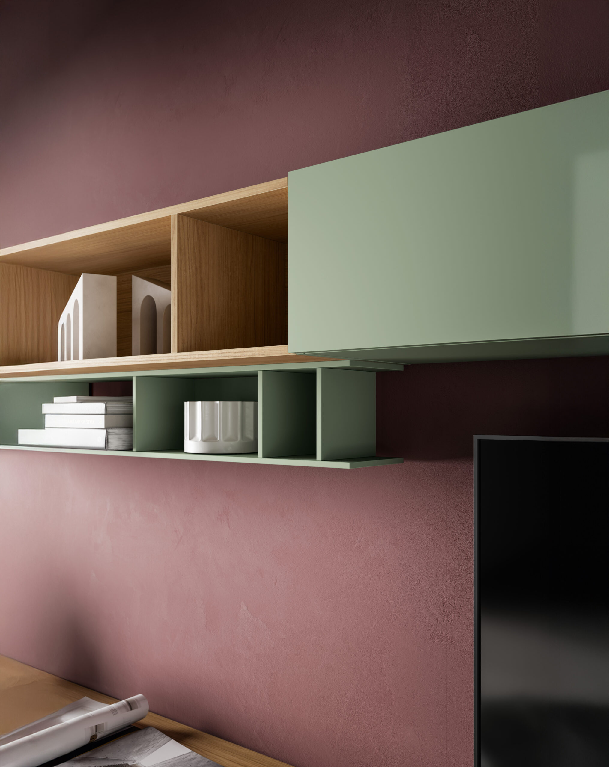 Both, with this wall composition. Modern living room made up of compact volumes evenly distributed between shelves and wall units,