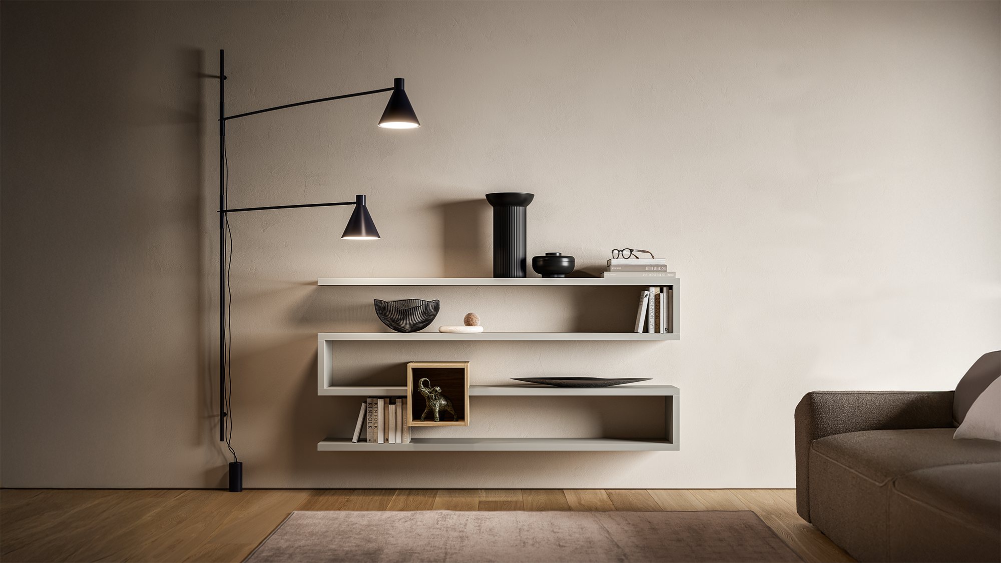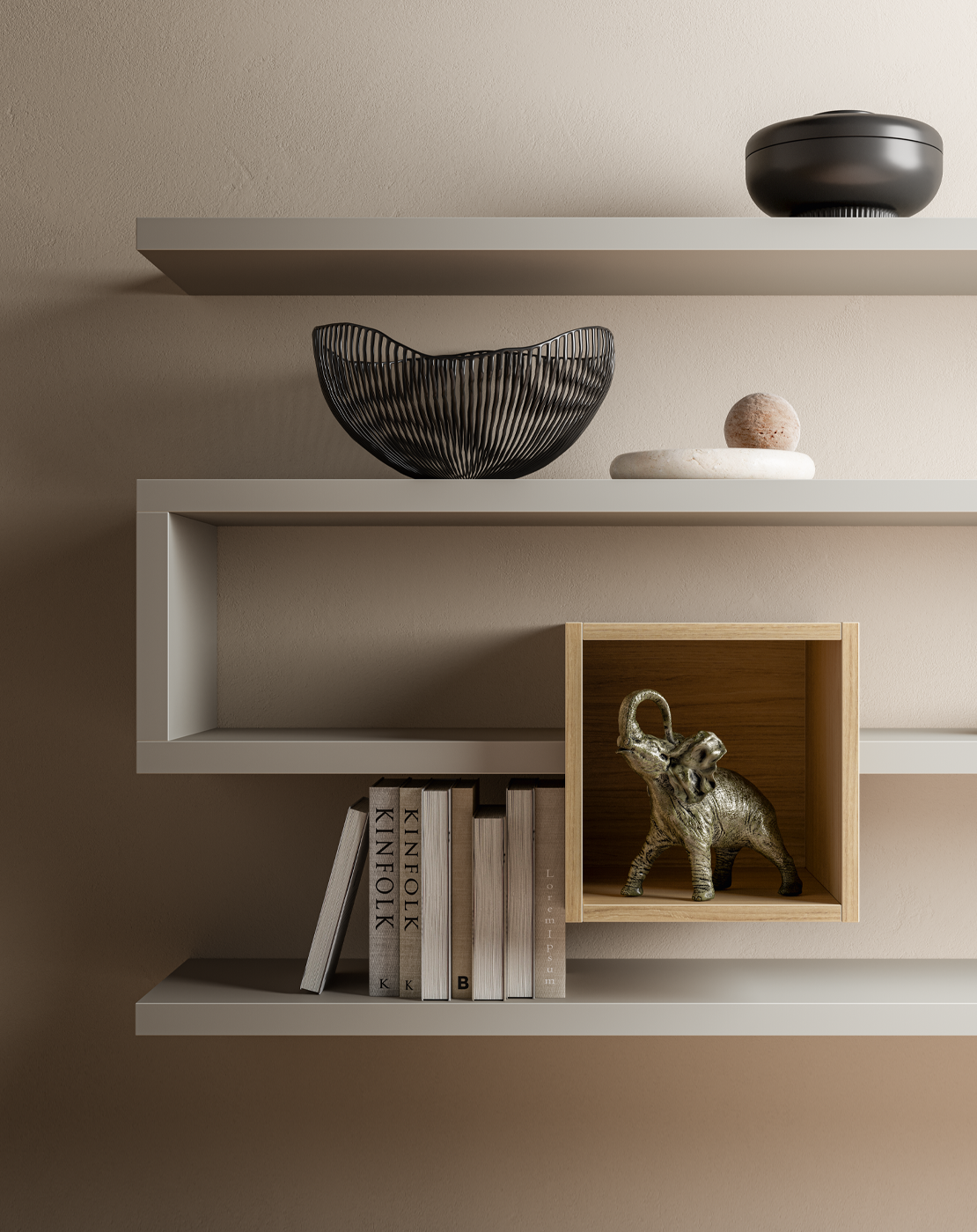 At the centre, a geometric open unit sits between the shelves,creating a focal point and storage space.