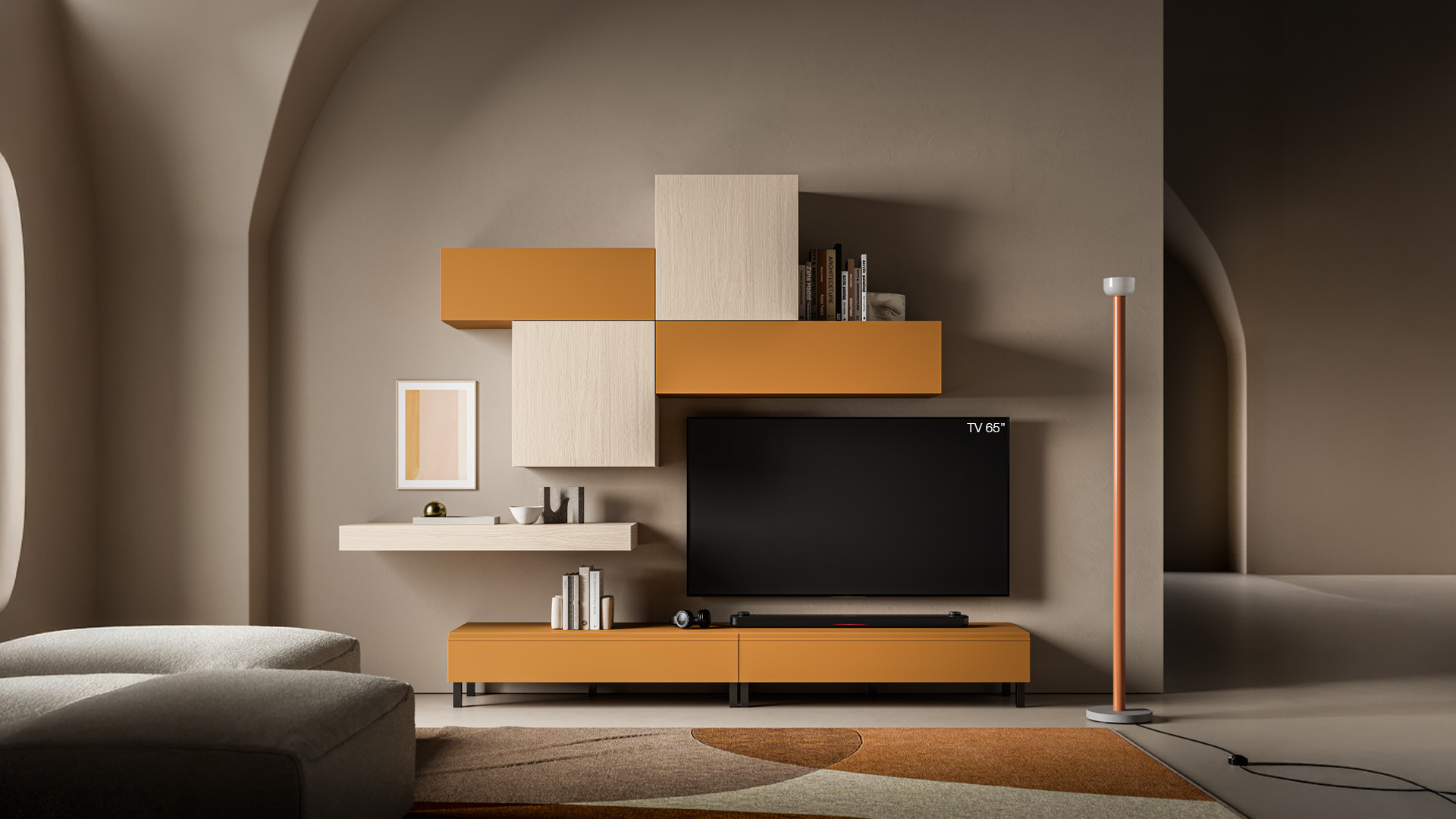 On the wall, an interplay of shapes, volumes and colours gives the living room a youthful feel. On the floor, the base units with brushed titanium height-adjustable feet guarantee stability and customisation.