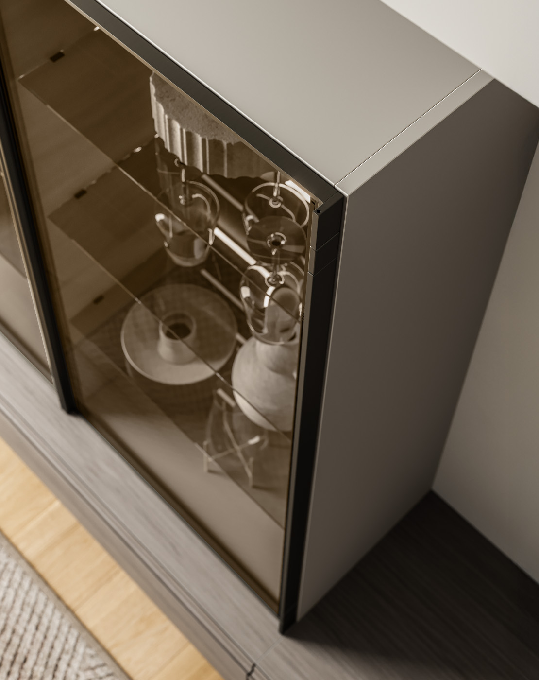 The 18 mm Stilo shelves and 4 mm-thick glass doors createthe perfect balance of lightness and strength.