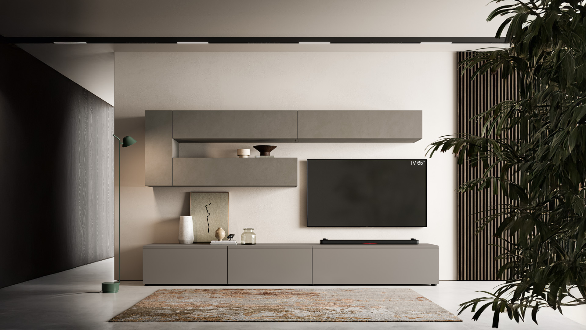 Simple, compact, geometric design. Units with tilt and flap doors define an organised and functional wall. A solution that emphasises the cleanliness of the lines, ideal for a contemporary and practical living room.