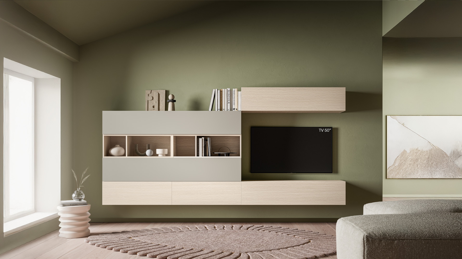 Relaxed lines and impeccable balance are the ingredients of a modern and minimalist living room in which open units and surfaces become the ideal canvas for expressing your personality with books and objects.
