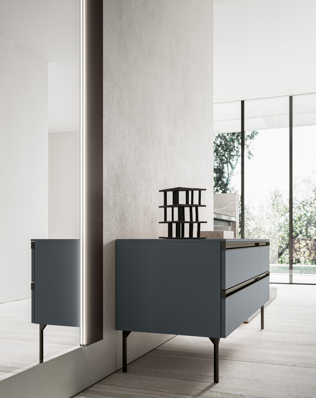 Ego bedside table W.460 – H.451 – D.496 | Ego dresser W.1225 – H.786 – D.496| Solano Plissé bed W.2829 – H.1135 – D.2068 | Luxury walk-in wardrobe W.3957 – H.2530 – D.615