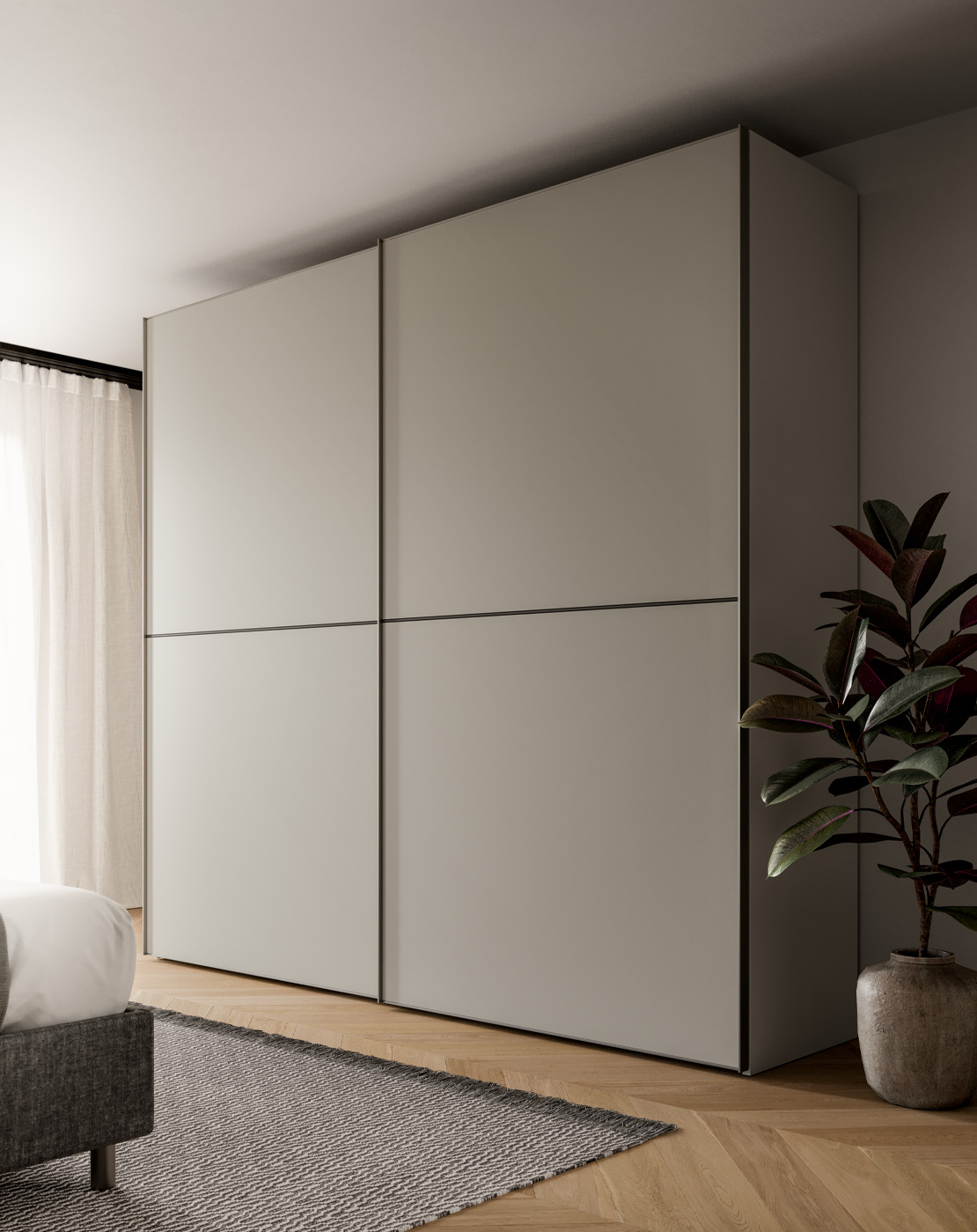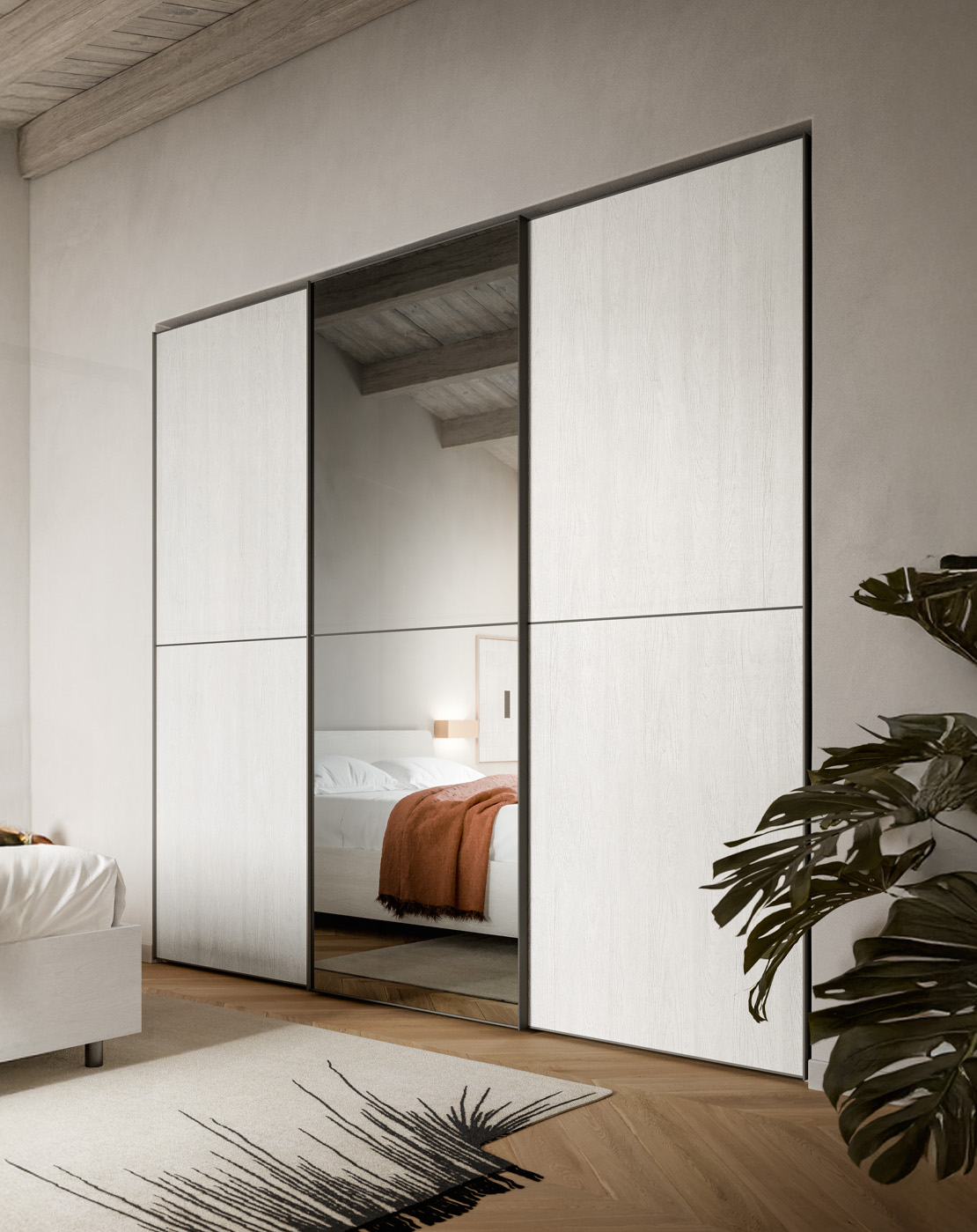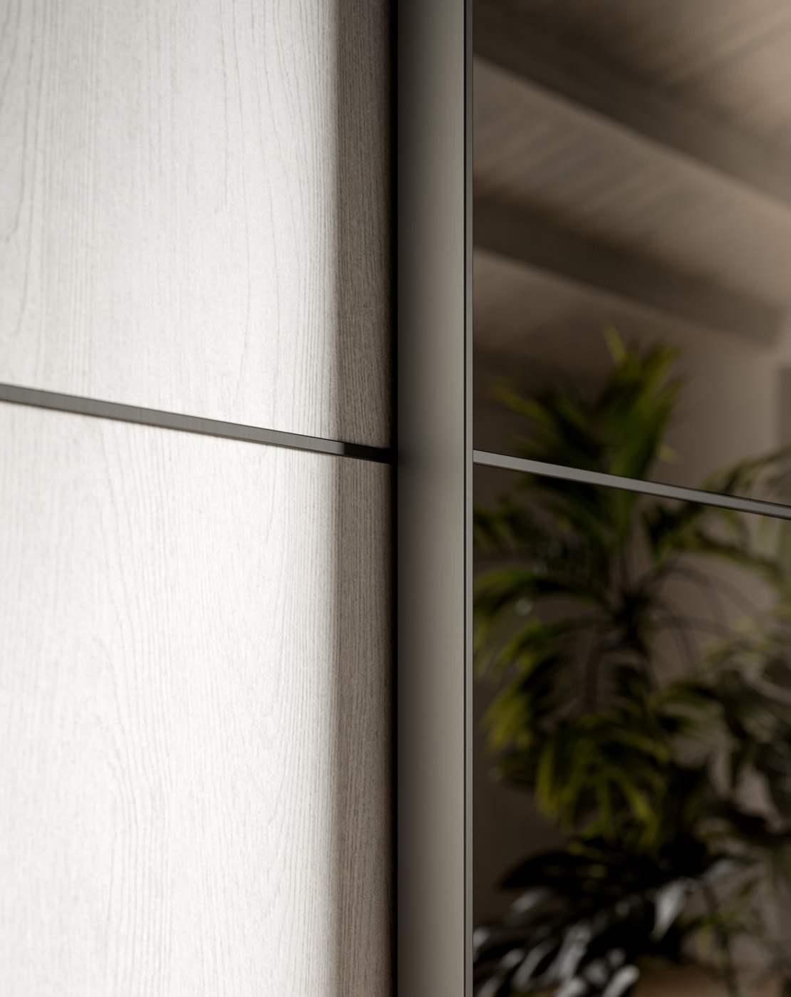 Ideal wardrobe for modern rooms with sliding doors with customisable finish and titanium profiles that add a touch of sophistication to the design.