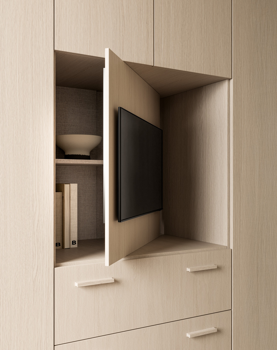 while the central compartment is closed with a TV panel with reversible rotation