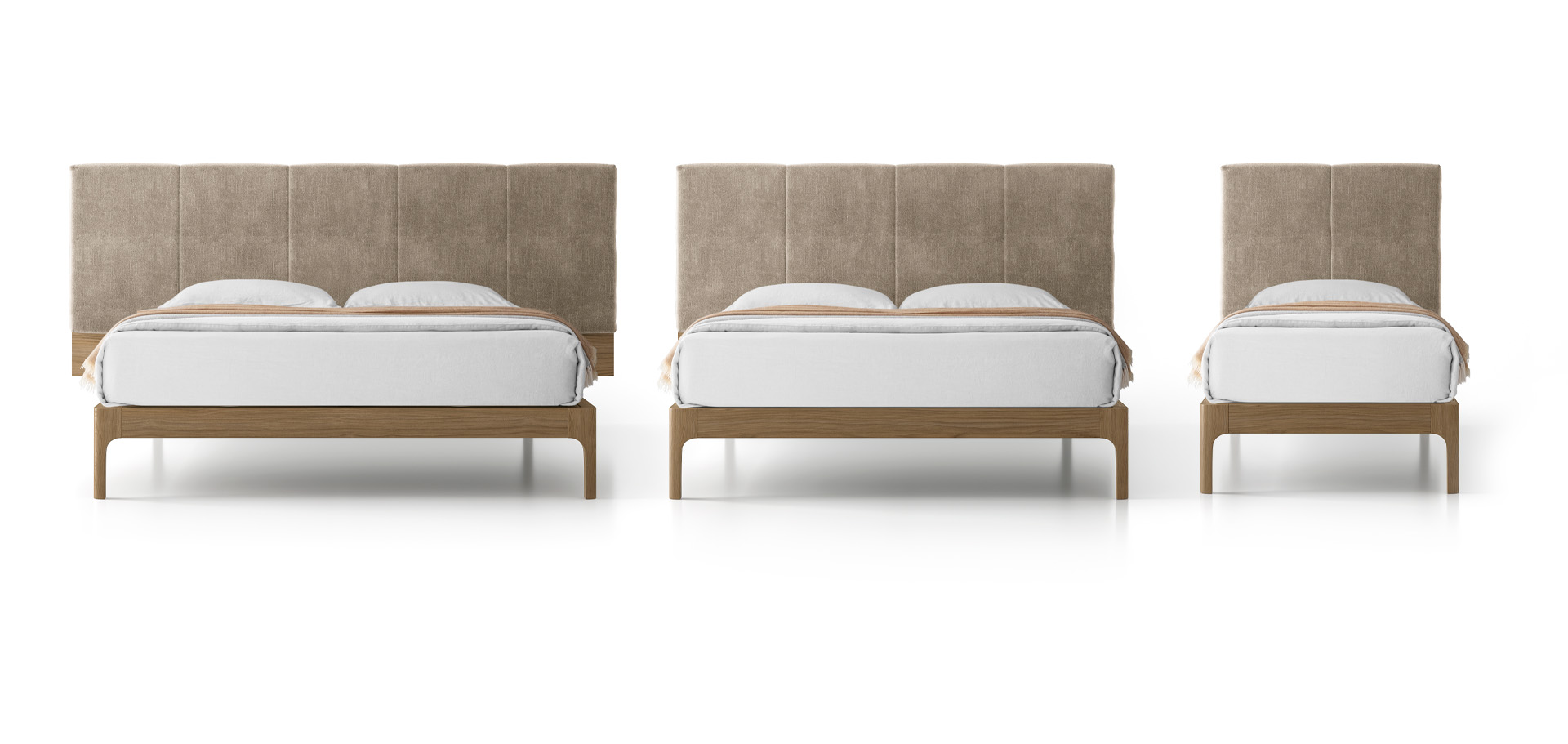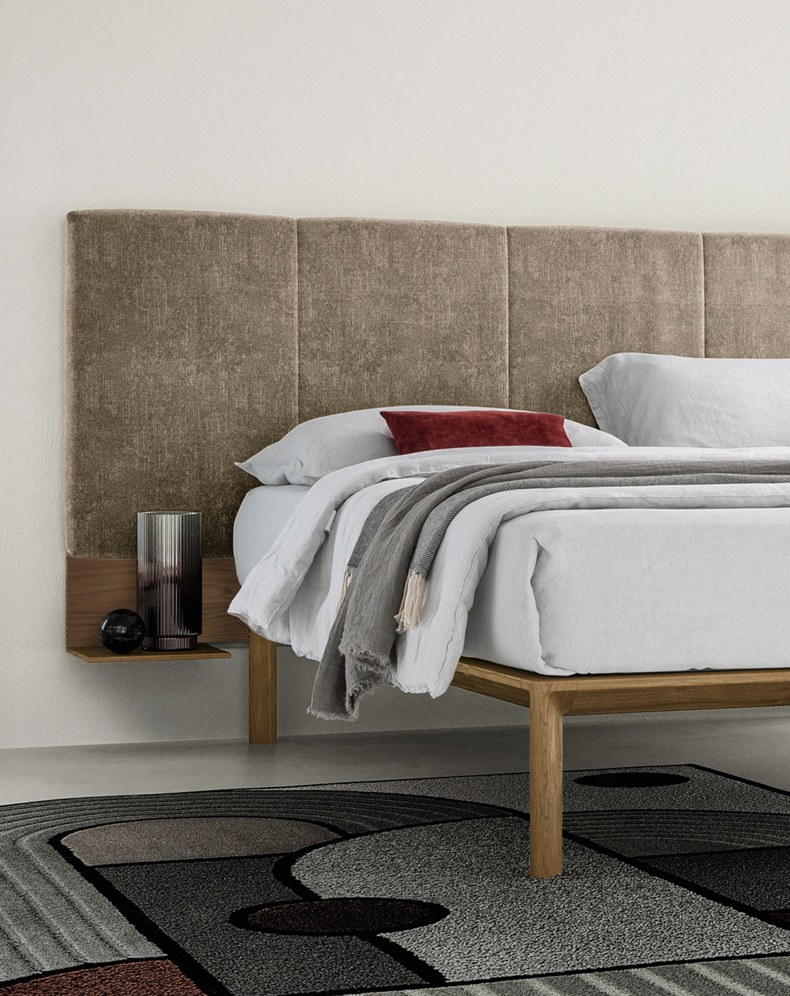 The wall-mounted headboard comes in modules in three different lengths: 100 cm, 200 cm and 250 cm, to fit all bed base sizes.