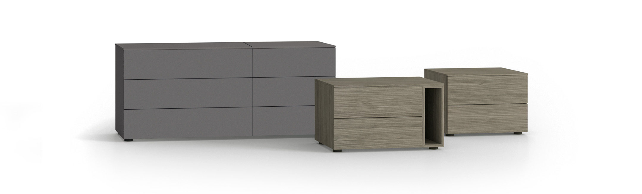 Comodino Sistema Ventidue L.460 – H.451 – P.496 | Comò Sistema Ventidue L.1225 – H.659 – P.496 | Letto Solano L.2829 – H.1135 – P.2098 | Armadio anta Spira battente L.3001 – H.2530 – P.622